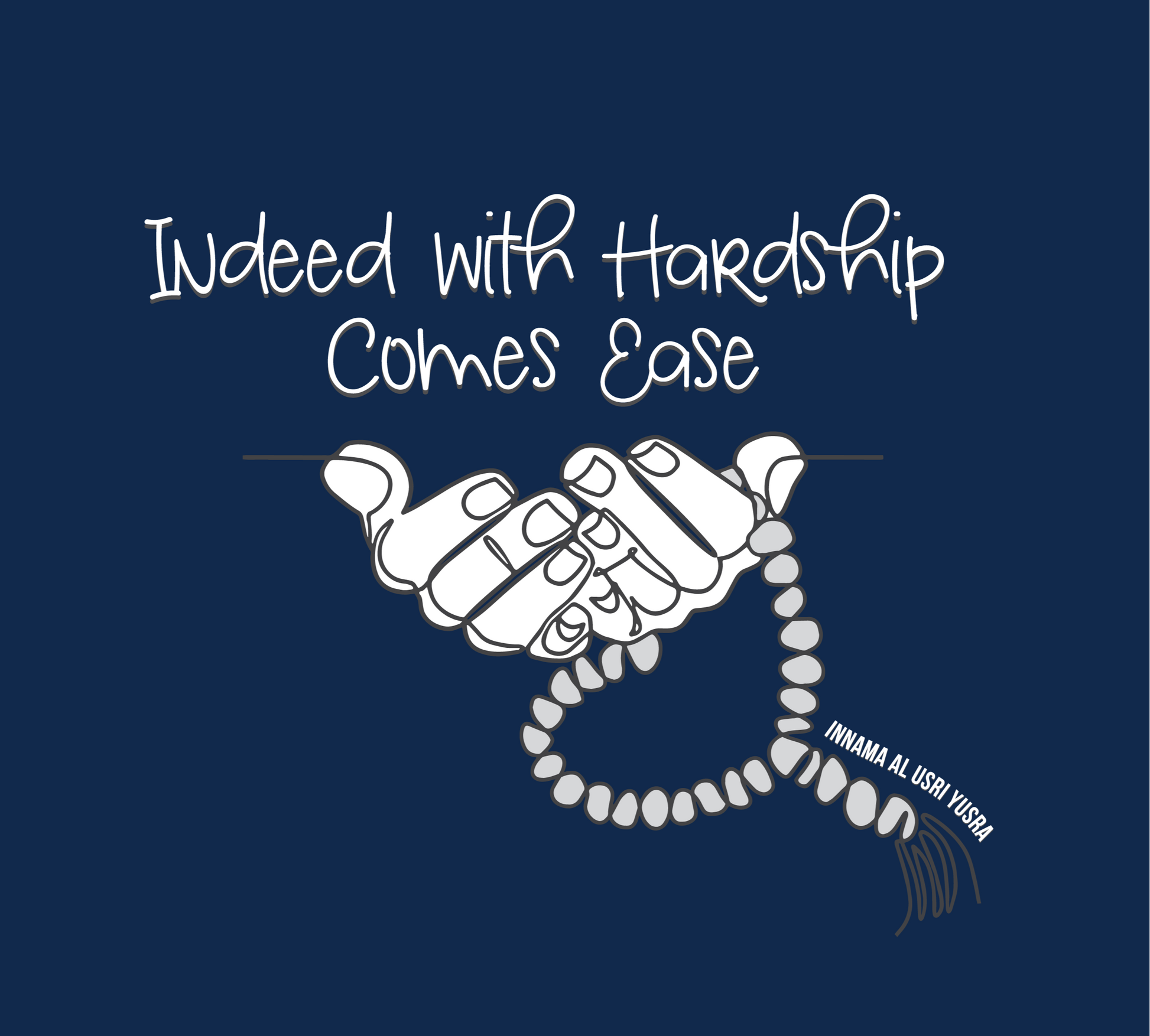 This premium navy hoodie features the powerful reminder "Indeed with hardship comes ease" across the chest, illustrated with two hands shaking and a strand of prayer beads flowing between them—symbolizing faith, unity, and trust in divine wisdom.