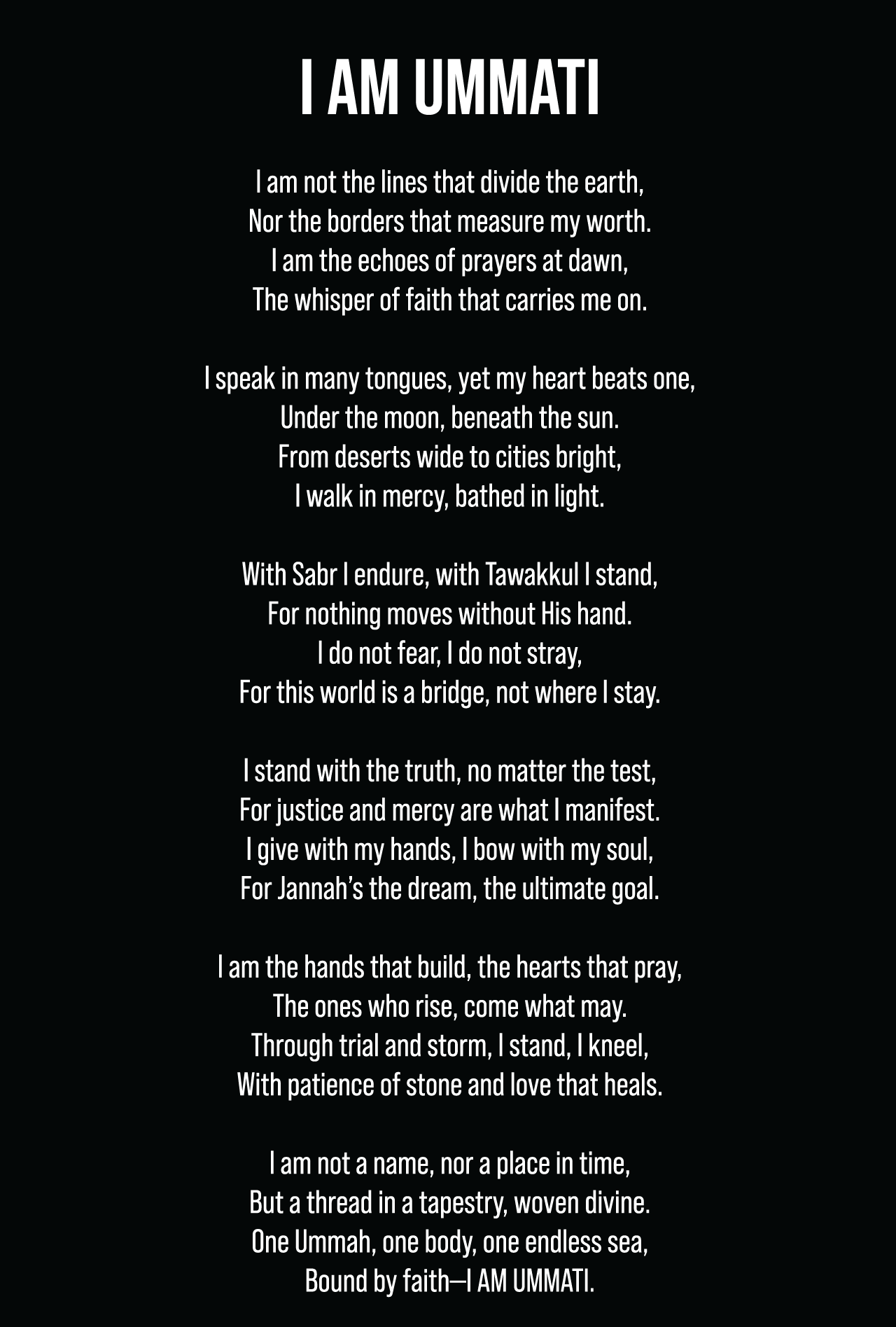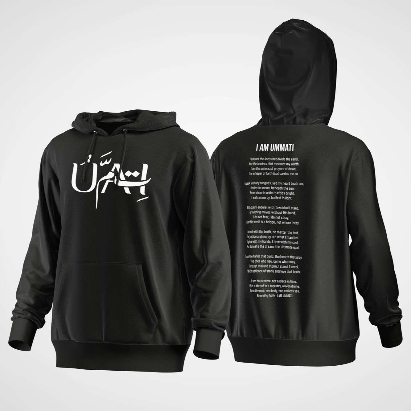 This premium black hoodie features "Ummati" in striking Arabic calligraphy across the chest—a proud declaration of identity and unity. On the back, the full "I AM UMMATI" poem is printed in crisp white text, speaking truth, resilience, and unwavering faith in every line.